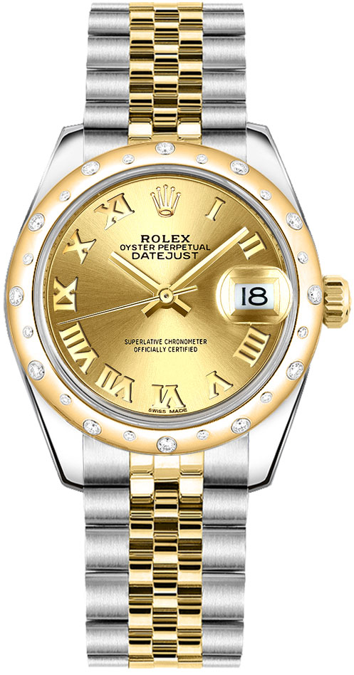 This 31mm watch features a champagne dial with roman numeral hour markers. 24 Diamonds set on the solid 18k yellow gold smooth bezel. Solid 18k yellow gold and oystersteel jubilee bracelet. Waterproof at 100 meters / 330 feet. Self-winding automatic movement with Rolex in-house calibre 2235. Power reserve up to 48 hours. Rolex Datejust 31 women's watch 178343.