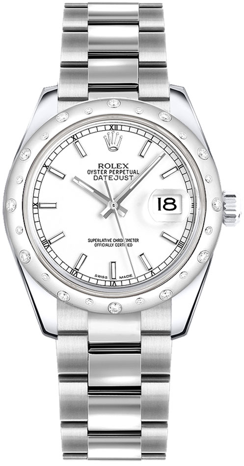 White dial with 24 diamonds set on the white gold bezel. Polished with brushed oystersteel oyster bracelet. Self-winding automatic movement with power reserve up to 48 hours. Waterproof at 100 meters / 330 feet. Luxury watch style. Swiss made. Rolex Datejust 31 women's watch 178344.
