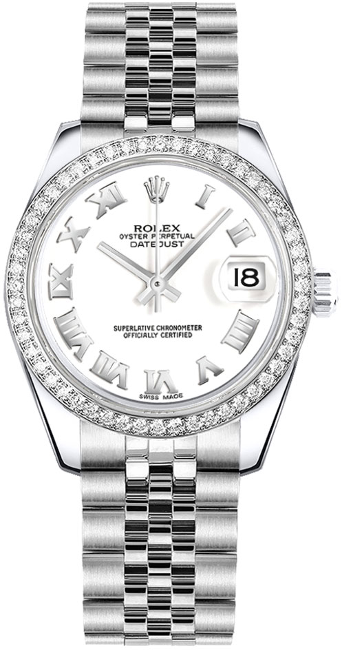 The dial is the distinctive face of a Rolex watch, every Rolex dial is designed and manufactured in-house, largely by hand to ensure perfection. White dial with white gold roman numeral hour markers. White gold and 46-diamond bezel. Polished with brushed oystersteel jubilee bracelet. Powered by calibre 2235 with a power reserve up to 48 hours. Waterproof at 100 meters / 330 feet. Luxury watch style. Swiss made. Rolex Datejust 31 women's watch 178384.