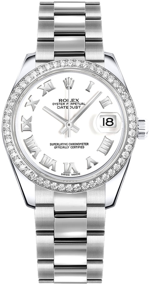 Every Rolex dial is designed and manufactured in-house, largely by hand to ensure perfection. White dial with white gold roman numeral hour markers. 46 Diamonds on a white gold bezel. Oystersteel oyster bracelet. Waterproof 100 meters / 330 feet. Self-winding automatic movement with a power reserve up to 48 hours. Luxury watch style. Swiss made. Rolex Datejust 31 women's watch 178384.