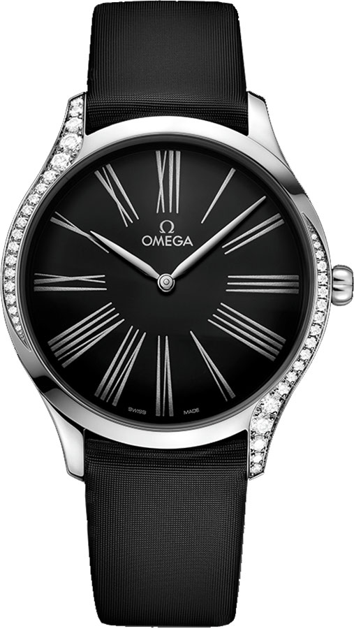 OMEGA DeVille Tresor 428.17.39.60.01.001 women's fashion watch. Stainless steel case with a black satin fabric strap. Fixed polished stainless steel bezel with diamond paving. Black dial. Roman numeral hour markers. Single diamond set on crown. Powered by the Omega caliber 4061 battery operated quartz movement. Domed scratch resistant sapphire crystal with anti-reflective treatment on the inside. 19mm inlet size. Special mirrored case back with a 'Her Time' pattern. Push and pull crown. Stainless steel tang buckle. Water resistant to 30 meters / 100 feet. Functions: hours, minutes. Fashion watch style. Swiss made.
