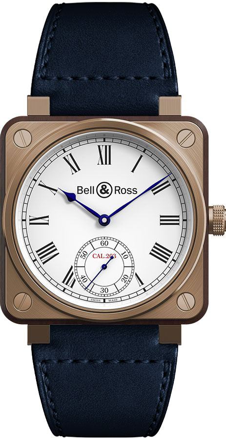 Bell & Ross Instrument de Marine BR01-CM-203-B-V-064 men's watch. Limited Edition, Numbered out of 500 ever made. Features a brushed CuSn8 bronze with precious wood case and navy blue calfskin strap. Brushed fixed CuSn8 bronze bezel. White lacquer dial with blued hands and Roman numeral hour markers. Small seconds sub-dial at 6 o'clock. Powered by the Bell & Ross Caliber BR-CAL.203 manual winding movement which boasts a 56 hour power reserve, beats at 21,600 vph and contains 17 jewels. A scratch resistant sapphire crystal with anti-reflective coating protects the dial. The case is square and 46mm in diameter. Inlet size: 24mm. Titanium sapphire crystal exhibition cases back. Push and pull crown. Bronze tang buckle. Water resistant to 100 meters / 330 feet. Functions: hours, minutes, small seconds. Casual watch style. Swiss made.