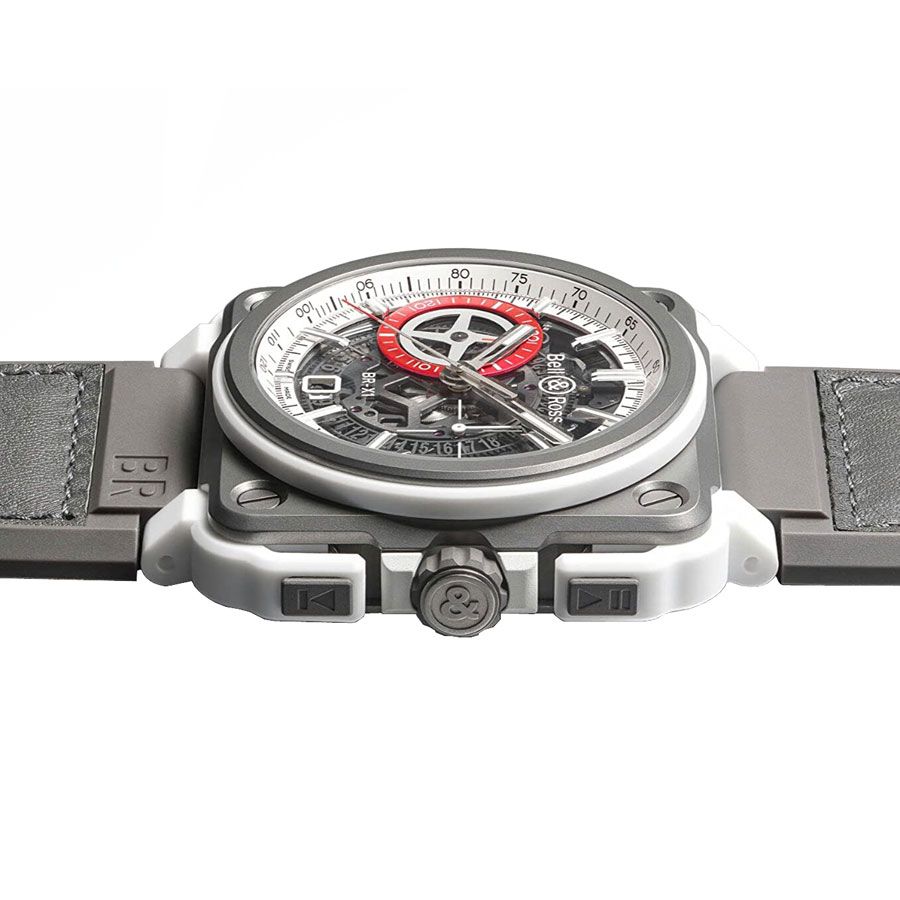 Bell & Ross Experimental White Hawk BRX1-WHC-TI men's watch. Limited Edition, Numbered out of 250 ever made. Features a microblasted titanium with matte white ceramic case and grey rubber strap with calfskin leather outer lining. Titanium fixed bezel. Skeleton black dial with red accents. Luminescent hands and index hour markers. Date window displayed at 6 o'clock. Chronograph with large central chronograph seconds hand and 30 minute counter sub-dial at 9 o'clock. Small seconds sub-dial at 3 o'clock. Tachymeter scale feature. Powered by the Bell & Ross Caliber BR-CAL.313 self-winding automatic movement which boasts a 40 hour power reserve, beats at 28,800 vph and contains 56 jewels. A scratch resistant sapphire crystal protects the dial. The casei s square and 45mm in diameter. Sapphire crystal exhibition case back. Brushed stainless steel tang buckle. Water resistant to 100 meters / 330 feet. Functions: hours, minutes, small seconds, date, chronograph, tachymeter. Sport watch style. Swiss made.