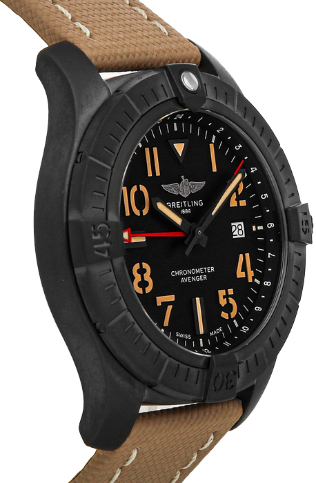Breitling Avenger Automatic GMT 45 V32395101B1X1 men's watch. Features a brushed black DLC-coated titanium case and sand colored military leather strap. Brushed black DLC-coated titanium unidirectional rotating bezel. Black dial with luminescent hands and arabic numeral hour markers. Date window displayed at 3 o'clock. GMT second time zone feature. Powered by the Breitling Caliber 32 self-winding automatic COSC Chronometer certified movement which boasts a 42 hour power reserve, beats at 28,800 vph and contains 21 jewels. A cambered scratch resistant sapphire crystal protects the dial. The case is round, 45mm in diameter, weighs 220g and is 12.31mm thick. Inlet size: 22mm. Grip-patterned Screw down crown and case back. DLC-coated Stainless steel tang buckle. Water resistant to 300 meters / 1000 feet. Functions: hours, minutes, seconds, date, GMT. Casual watch style. Swiss made.