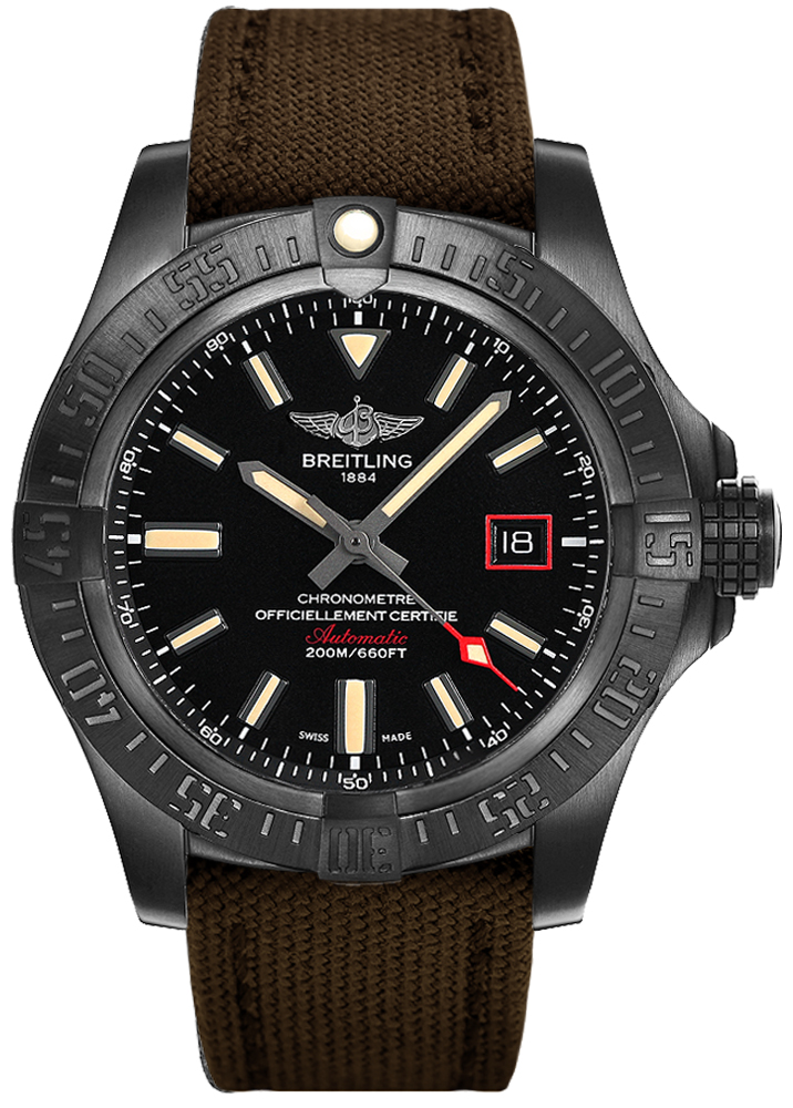 Breitling Avenger Blackbird 44 V1731110/BD74-108W men's watch. Features a brushed black titanium case and brown canvas strap. Brushed black titanium unidirectional rotating bezel engraved with 60 minute scale. Volcano black dial with luminescent hands and index hour markers. Black flange with 60 second and minute scale. Date window displayed at 3 o'clock. Powered by the Breitling Caliber 17 self-winding automatic COSC Chronometer certified movement which boasts a 38 hour power reserve, beats at 28,800 vph and contains 25 jewels. A scratch resistant cambered sapphire crystal glareproofed on both sides protects the dial. The case is round, 44mm, weighs 73.60g and is 12.7mm thick. Inlet size: 22mm. Solid screw down case back. Screw down crown. Black steel deployment buckle. Water resistant to 200 meters / 660 feet. Functions: hours, minutes, seconds, date. Casual watch style. Swiss made.