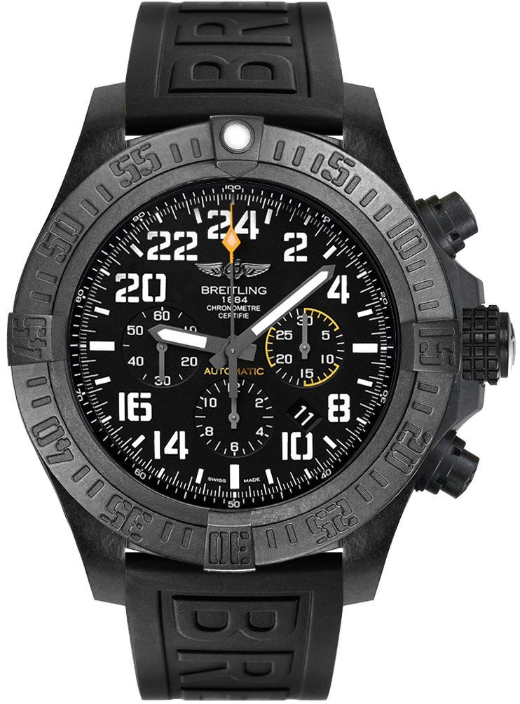 Breitling Avenger Hurricane XB1210E41B1S2 men's watch. Features a black polymer case and black Diver Pro III rubber strap. Black polymer unidirectional rotating bezel. Volcano black dial with luminescent hands, index and Arabic numeral hour markers Date displayed in dial aperture between 4 and 5 o'clock. Chronograph with large central chronograph seconds hand, 30 minute counter sub-dial at 3 o'clock and 12 hour counter sub-dial at 6 o'clock. Small seconds sub-dial at 9 o'clock. Powered by the Breitling Caliber B12 self-winding automatic COSC Chronometer certified movement which boasts a 70 hour power reserve, beats at 28,800 vph and contains 47 jewels. A cambered scratch resistant sapphire crystal glareproofed on both sides protects the dial. The case is round, 50mm in diameter, weighs 68.90g and is 16.95mm thick. Inlet size: 24mm. Screw-locked crown with 2 gaskets. Screw down case back. Tang buckle. Water resistant to 100 meters / 330 feet. Functions: hours, minutes, small seconds, date, chronograph. Sport watch style. Swiss made.
