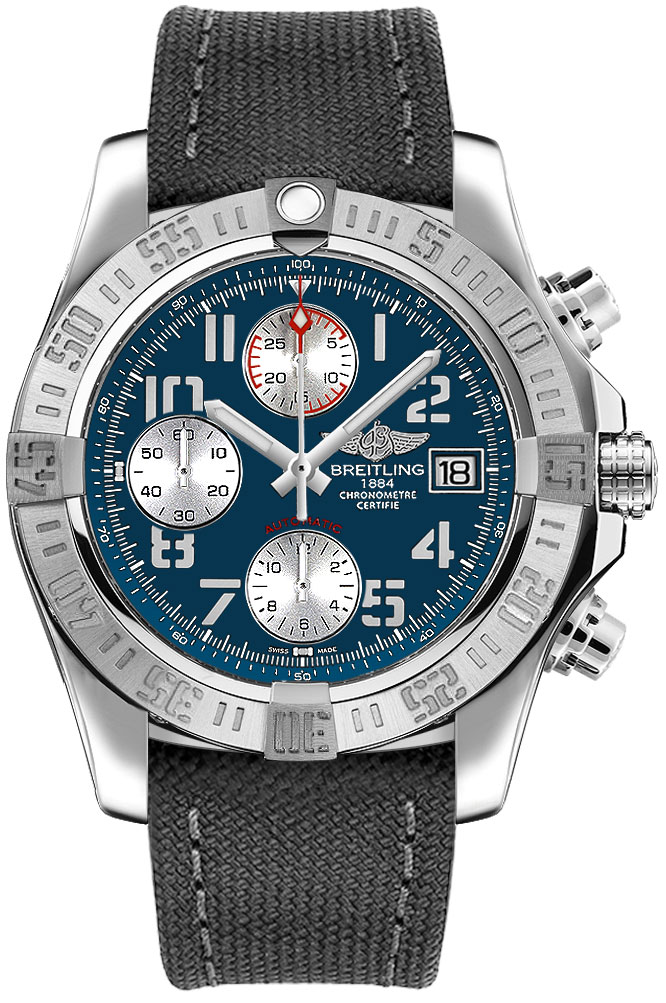 Breitling Avenger II A13381111C1W1 men's watch. Features a brushed stainless steel case and military anthracite rubber strap. Stainless steel unidirectional rotating bezel. Mariner blue dial with silver sub-dials and luminescent hands, index and "stenciled" Arabic numeral hour markers Date displayed in dial aperture at 3 o'clock. Chronograph with large central chronograph seconds hand, 30 minute counter sub-dial at 12 o'clock and 12 hour counter sub-dial at 6 o'clock. Small seconds sub-dial at 9 o'clock. Powered by the Breitling Caliber B13 self-winding automatic COSC Chronometer certified movement which boasts a 42 hour power reserve, beats at 28,800 vph and contains 25 jewels. A cambered scratch resistant sapphire crystal glareproofed on both sides protects the dial. The case is round, 43mm in diameter, weighs 100.0g and is 16.5mm thick. Inlet size: 22mm. Screw-locked crown with 2 gaskets. Screw down case back. Tang buckle. Water resistant to 300 meters / 1000 feet. Functions: hours, minutes, small seconds, date, chronograph. Sport watch style. Swiss made.