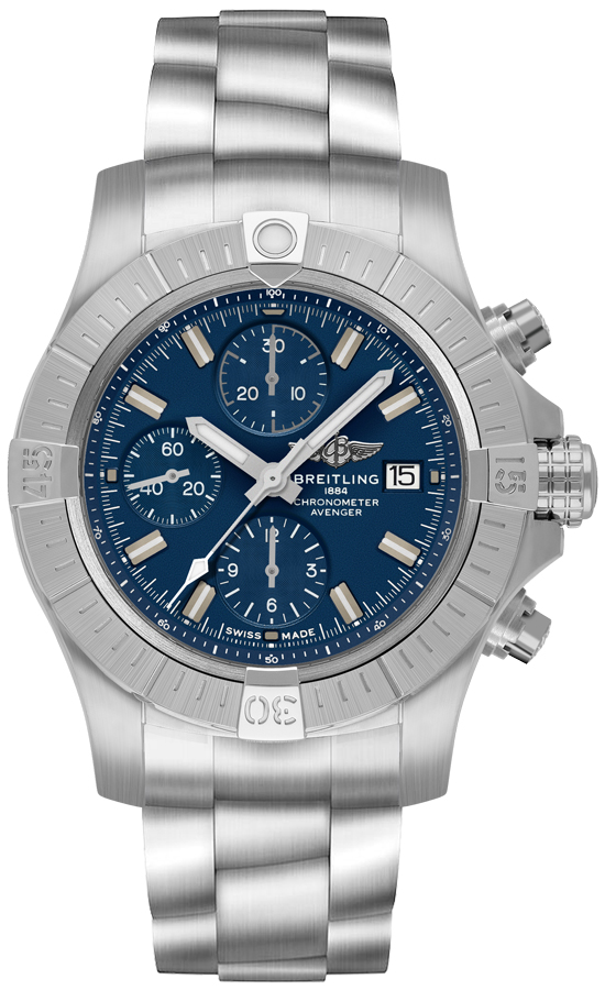 Breitling Avenger Chronograph 43 Men's Watch A13385101C1A1. This 43mm watch features a stainless steel case and bracelet with deployment buckle. The blue dial has luminescent hands and hour markers with a chronograph, a date window displayed at 3 o'clock, and a small seconds sub-dial at 9 o'clock. It is powered by the Breitling Caliber B13 self-winding automatic COSC Chronometer certified movement with a 48 hour power reserve.