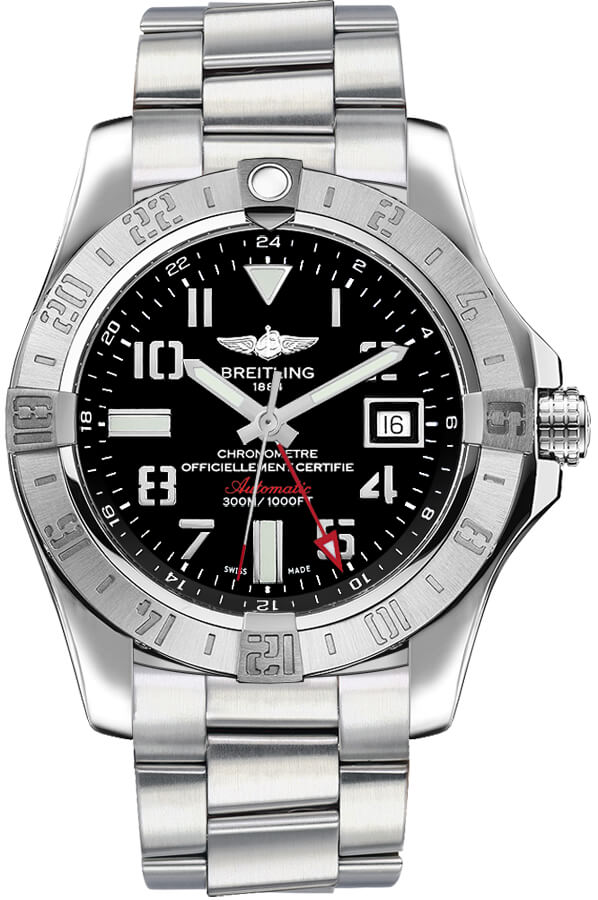 Breitling Avenger II GMT A3239011/BC34-173A men's watch. Features a polished stainless steel case and brushed Professional III stainless steel bracelet. Brushed stainless steel bidirectional rotating bezel engraved with Arabic numerals and index markers. Volcano black dial with luminescent hands and index hour markers. Date displayed in window at 3 o'clock. GMT second time zone feature indicated by red GMT hand and GMT third time zone indicated by rotating bezel. Powered by the Breitling Caliber 32 self-winding automatic COSC Chronometer certified movement which boasts a 42 hour power reserve, beats at 28,800 vph and contains 21 jewels. A scratch resistant sapphire crystal protects the dial. The case is round, 43mm in diameter, weighs 93.75g and is 12.20mm thick. Inlet size: 22mm. Screw down crown with non-slip grip. Screw down case back. Stainless steel deployment buckle. Water resistant to 300 meters / 1000 feet. Functions: hours, minutes, seconds, date. Sport watch style Swiss made.
