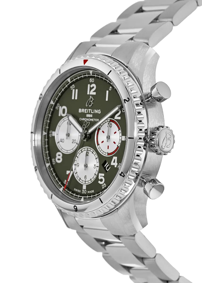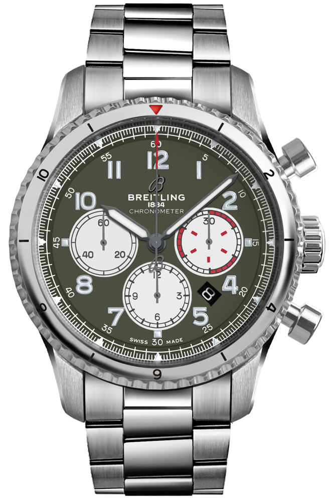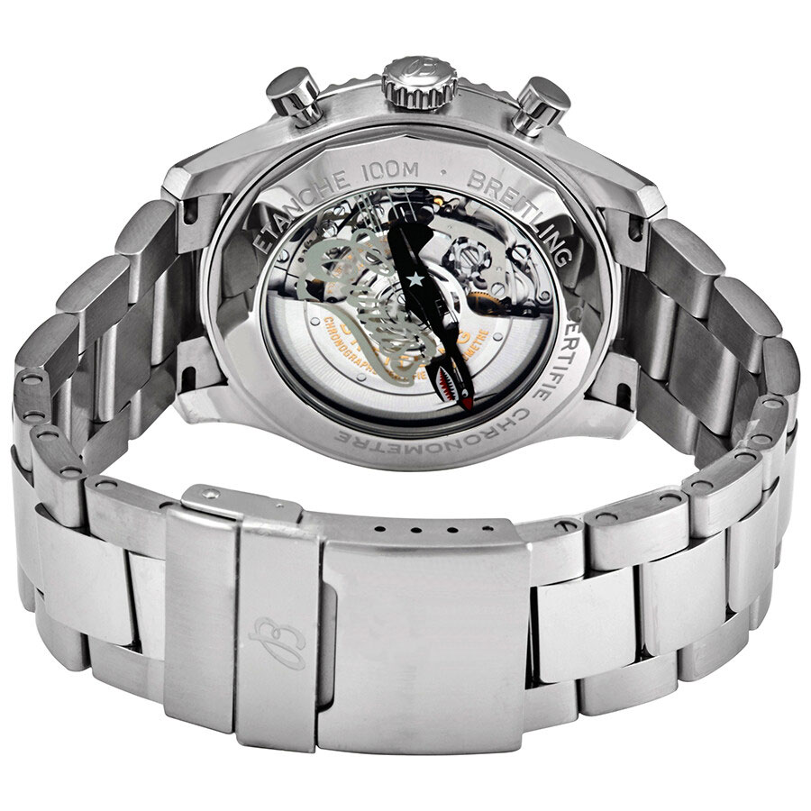 Breitling Navitimer Aviator 8 Curtiss Warhawk AB01192A1L1A1 men's watch. Features a polished with brushed stainless steel case and Professional III bracelet. Polished stainless steel bidirectional rotating bezel. Date displayed in dial aperture between 4 and 5 o'clock. Chronograph with large central chronograph seconds hand, 30 minute counter sub-dial at 3 o'clock and 12 hour counter sub-dial at 6 o'clock. Small seconds sub-dial at 9 o'clock. Powered by the Breitling Caliber 01 self-winding automatic COSC Chronometer certified movement which boasts a 70 hour power reserve, beats at 28,800 vph and contains 47 jewels. A cambered scratch resistant sapphire crystal glareproofed on both sides protects the dial. The case is round, 43mm in diameter, weighs 110g and is 13.97mm thick. Inlet size: 23mm. Sapphire crystal exhibition case back with Curtiss inscription and vivid graphic of P-40 Warhawk. Screw-locked crown with 2 gaskets. Screw down case back. Stainless steel deployment buckle. Water resistant to 100 meters / 330 feet. Functions: hours, minutes, small seconds, date, chronograph. Sport watch style. Swiss made.