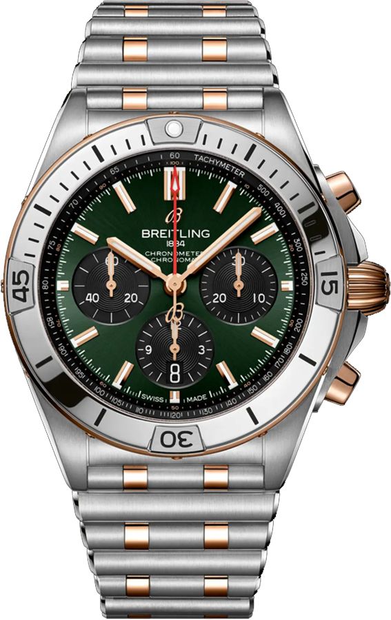 Upgrade your timepiece collection with the Breitling Chronomat B01 42 UB0134131L1U1. This stunning watch features a striking green dial complemented by index hour markers, a convenient date display, and a highly functional chronograph and tachymeter. The 42mm stainless steel and rose gold case adds a touch of sophistication, while the two-tone Rouleaux bracelet with a deployment buckle ensures a comfortable and secure fit. Powered by an automatic movement and certified as a chronometer, this timepiece effortlessly combines luxury and precision in one elegant package. Elevate your style with the timeless elegance of the Breitling Chronomat B01 42 UB0134131L1U1.