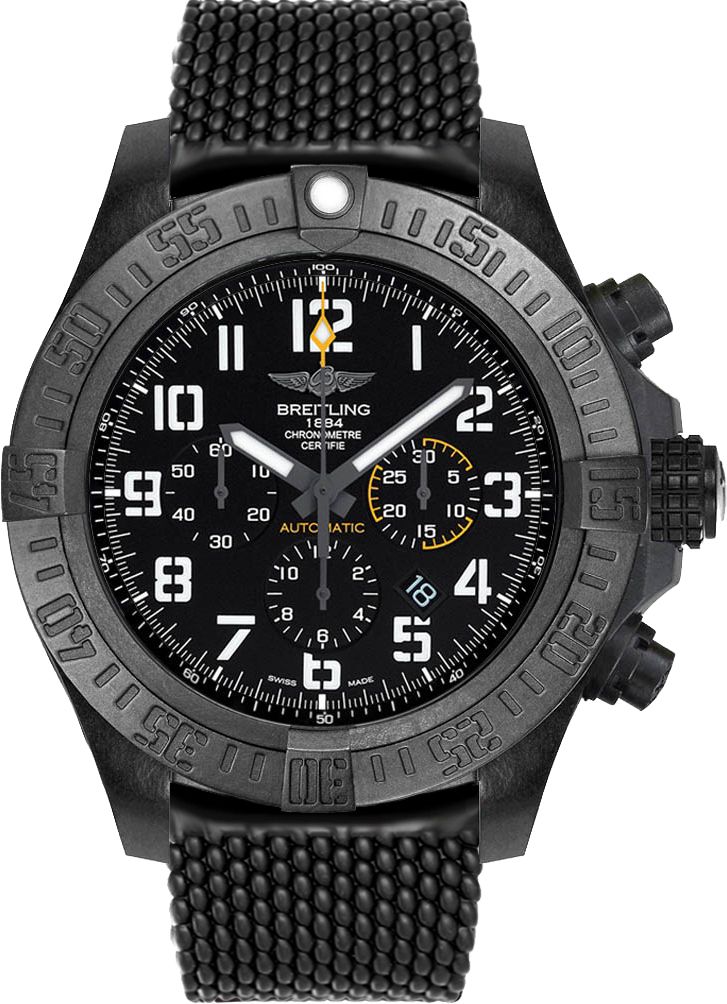 Breitling Avenger Hurricane XB0170E4/BF29-256S men's watch. Features a matte black polymer case and black Aero Classic rubber strap, Matte black unidirectional rotating polymer bezel engraved with minute markers. Volcano black dial with luminescent hands and Arabic numeral hour markers. Date displayed in dial aperture between 4 and 5 o'clock. Chronograph with large yellow tipped central chronograph 1/4 seconds hand, 30 minute counter sub-dial at 3 o'clock and 12 hour counter sub-dial at 6 o'clock. Small seconds sub-dial at 9 o'clock. Powered by the Breitling Caliber 01 self-winding automatic COSC Chronometer certified movement which boasts a 70 hour power reserve, beats at 28,800 vph and contains 47 jewels. A scratch resistant glareproof sapphire crystal protects the dial. The case is round, 50mm in diameter, weighs 68.92g and is 16.97mm thick. Inlet size: 24mm. Screw down crown and case back. Black polymer deployment buckle. Water resistant to 100 meters / 330 feet. Functions: hours, minutes, small seconds, date, chronograph. Sport watch style. Swiss made.