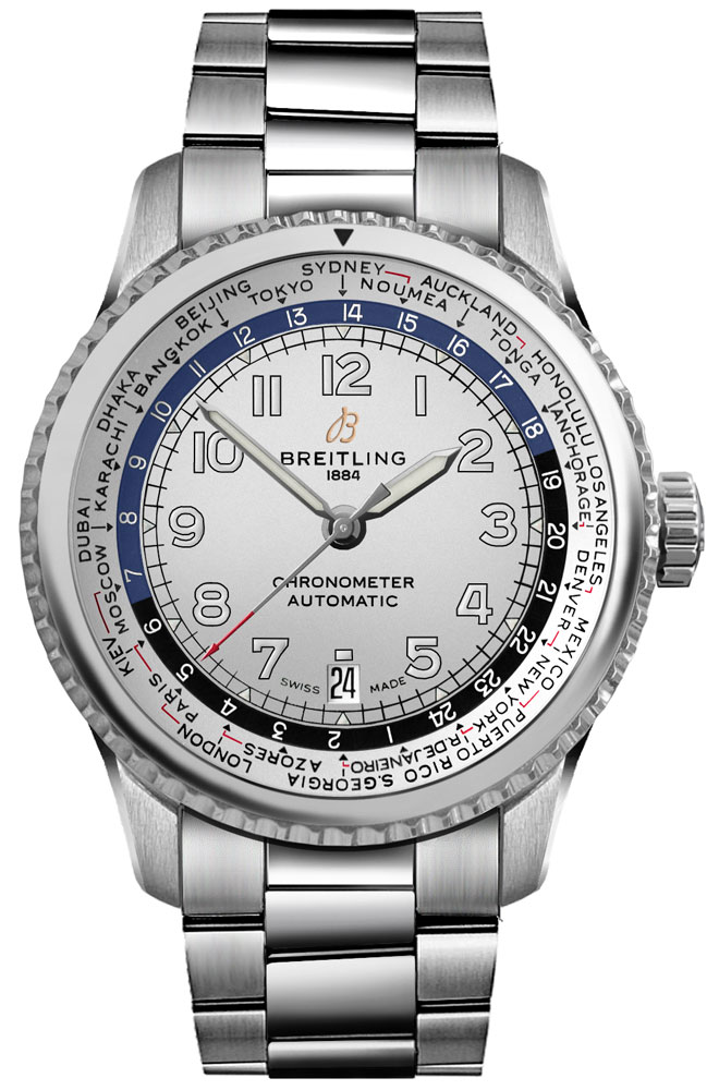 Also Known As Model # AB3521 / AB3521U0 G838 188A / AB3521U0-G838-188A Breitling Navitimer Aviator 8 B35 Automatic Unitime 43 AB3521U01G1A1 Mens Watch. Features a brushed with polished stainless steel case and brushed with polished stainless steel Professional III bracelet. Bezel type: Bidirectional rotating. The arabic numeral hour markers and hour and minute hands are luminescent. Dial type is analog. Dial color is Mercury Silver. The date is displayed at 6 o'clock. The world-time is indicated through an independent hour hand that can be adjusted with the crown. A city ring circles the dial. Powered by the Breitling Caliber B35 self-winding automatic chronometer certified movement which boasts a 70 hour power reserve, beats at 28,800 vph and contains 41 jewels. Has a cambered scratch resistant sapphire crystal protecting the dial which is glareproofed on both sides and a see-through sapphire crystal case back. The case is round, 43mm in diameter and is 14.55mm thick. The crown is screw-locked and the case back is screwed in. Inlet width: 23 mm. Stainless steel deployment buckle. Water-Resistant to 100 meters / 330 feet. Functions: hours, minutes, seconds, date, world time. Luxury watch style. Swiss Made.