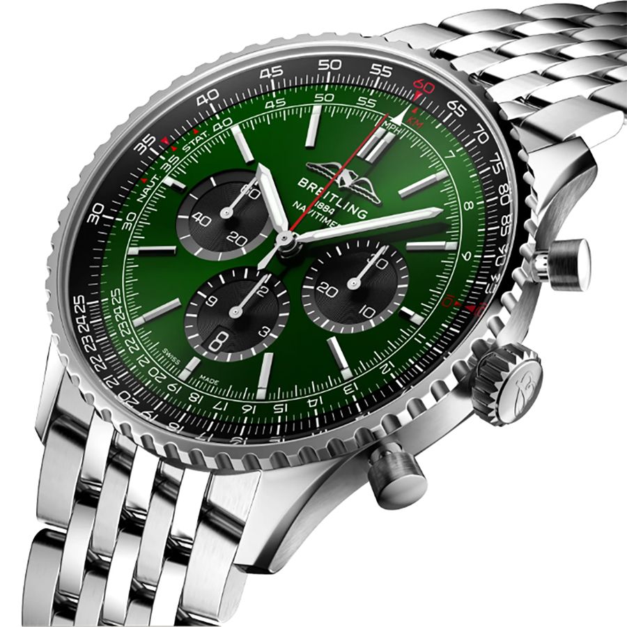Experience the perfect blend of style and functionality with the Breitling Navitimer B01 Chronograph 46 AB0137241L1A1. This timepiece features a striking green dial accented with index hour markers and a practical date display. The chronograph function and slide rule add a touch of sophistication, while the 46mm stainless steel case ensures durability. The bidirectional rotating bezel and steel bracelet with deployment buckle offer both style and ease of wear. Powered by an automatic movement, this chronometer is the epitome of precision and reliability. Elevate your wrist game with the Breitling Navitimer B01 Chronograph 46 AB0137241L1A1.