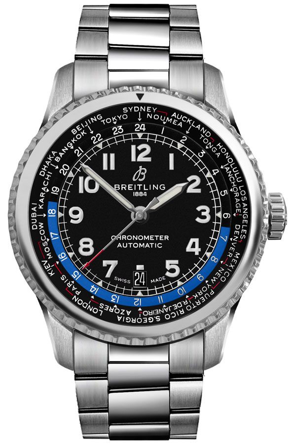Breitling Navitimer Aviator 8 B35 Automatic Unitime 43 AB3521U41B1A1 men's watch. Features a brushed with polished stainless steel case and brushed with polished stainless steel Professional III bracelet. Bezel type: Bidirectional rotating. The Arabic numeral hour markers and hour and minute hands are luminescent. Dial type is analog. Dial color is black. The date is displayed at 6 o'clock. The world-time is indicated through an independent hour hand that can be adjusted with the crown. A city ring circles the dial. Powered by the Breitling Caliber B35 self-winding automatic chronometer certified movement which boasts a 70 hour power reserve, beats at 28,800 vph and contains 41 jewels. Has a cambered scratch resistant sapphire crystal protecting the dial which is glareproofed on both sides and a see-through sapphire crystal case back. The case is round, 43mm in diameter and is 14.55mm thick. The crown is screw-locked and the case back is screwed in. Inlet width: 23 mm. Stainless steel deployment buckle. Water-Resistant to 100 meters / 330 feet. Functions: hours, minutes, seconds, date, world time. Luxury watch style. Swiss Made.