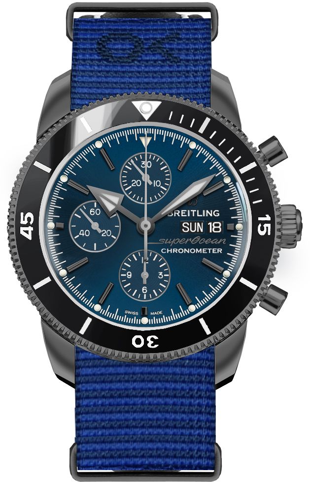 Breitling Superocean Heritage II Chronograph 44 Outerknown M133132A1C1W1 men's watch. Features a brushed black steel case and blue nylon yarn NATO strap. Black steel unidirectional rotating bezel. Blue dial with luminescent hour hand, minute hand and dot markers. Day of the week and date displayed in dial apertures at 3 o'clock. Chronograph with large central chronograph seconds hand, 30 minute counter at 12 o'clock and 12 hour counter at 6 o'clock. Small seconds sub-dial at 9 o'clock. Powered by the Breitling Caliber 13 self-winding automatic COSC Chronometer certified movement which boasts a 48 hour power reserve, beats at 28,800 vph and contains 25 jewels. A cambered, scratch resistant sapphire crystal glareproofed on both sides protects the dial. The case is round, 44mm in diameter, weighs 129.20g and is 15.65mm thick. Inlet size: 22mm. Screw-locked crown with 2 gaskets. Screw down case back with Outerknown logo. Black Steel Tang Buckle. Water resistant to 200 meters / 660 feet. Functions: hours, minutes, small seconds, day, date, chronograph. Diving watch style. Swiss made.
