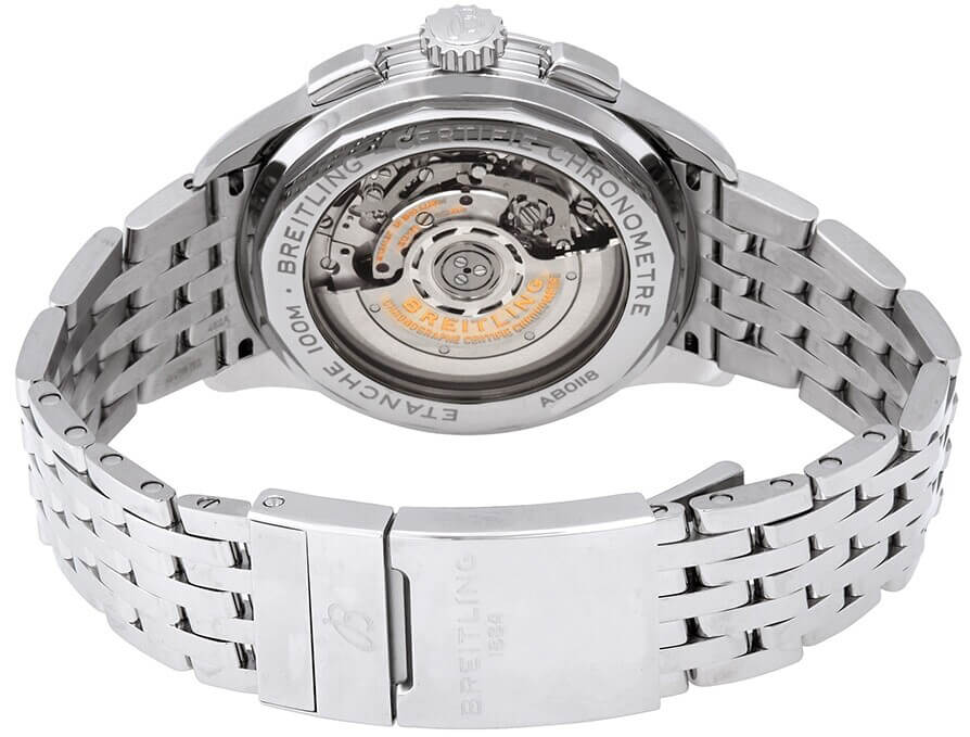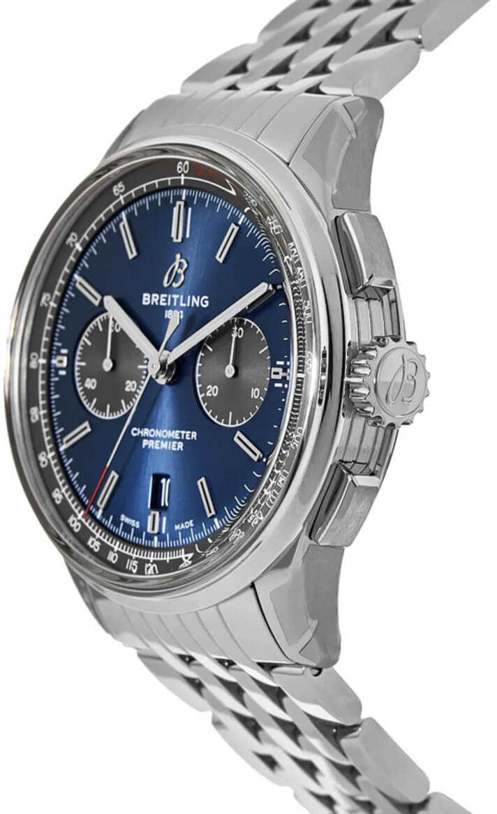 Breitling Premier B01 Chronograph 42 AB0118A61C1A1 men's watch. Features a polished stainless steel case and Navitimer bracelet. Polished stainless steel fixed bezel. Blue dial with black sub-dials. Luminescent hour and minute hands. Index hour markers. Date displayed in dial aperture at 6 o'clock. Chronograph with large central chronograph seconds hand and 30 minute counter sub-dial at 3 o'clock. Small seconds sub-dial at 9 o'clock. Tachymeter scale. Powered by the Breitling Caliber 01 self-winding automatic COSC Chronometer certified movement which boasts a 70 hour power reserve, beats at 28,800 vph and contains 47 jewels. A cambered, scratch resistant sapphire crystal glareproofed on both sides protects the dial. The case is round, 42mm in diameter and 13.65mm thick. Inlet size: 22mm. Sapphire crystal exhibition case back. Non screw-locked crown with 2 gaskets. Screw down case back. Stainless steel deployment buckle. Water resistant to 100 meters / 330 feet. Functions: hours, minutes, small seconds, date, chronograph, tachymeter. Casual watch style. Swiss made.