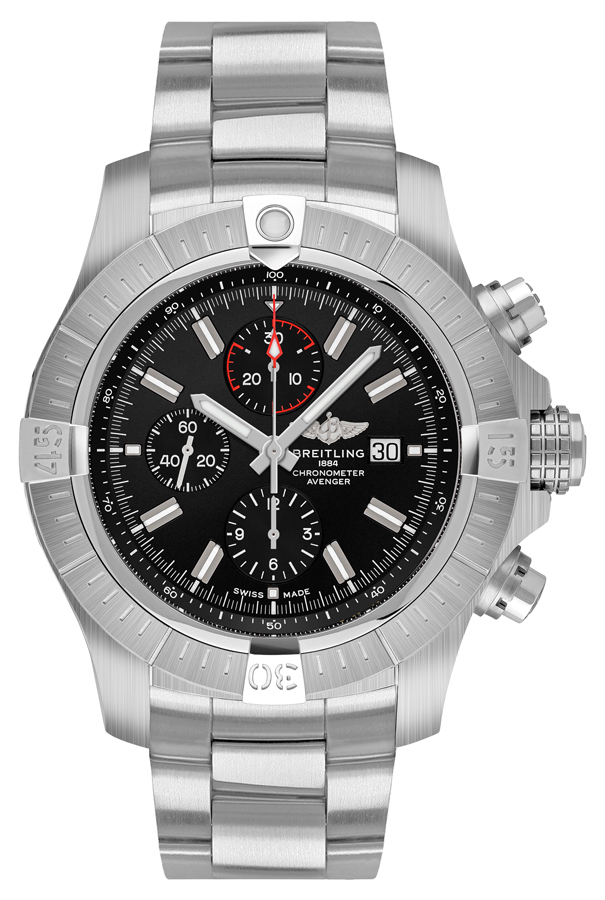 Breitling Super Avenger Chronograph 48 A13375101B1A1 men's watch. Features a brushed stainless steel case and bracelet. Brushed with polished stainless steel unidirectional rotating bezel with a 60 minute scale. Black dial with luminescent hands and index numeral hour markers. Date window displayed at 3 o'clock. 1/100th of a second scale around the outer rim of Dial. Chronograph with large central chronograph seconds hand, 30 minute counter sub-dial at 12 o'clock and 12 hour counter sub-dial at 6 o'clock. Small seconds sub-dial at 9 o'clock. Powered by the Breitling Caliber 13 self-winding automatic COSC Chronometer certified movement which boasts a 42 hour power reserve, beats at 28,800 vph and contains 25 jewels. A cambered scratch resistant sapphire crystal protects the dial. The case is round, 48mm in diameter, 17.73mm thick, case weight 280g and inlet size is 24mm. Screw down crown and case back. Stainless steel folding clasp deployment buckle. Water resistant to 300 meters / 1,000 feet. Functions: hours, minutes, seconds, date, chronograph. Sports watch style. Swiss made.