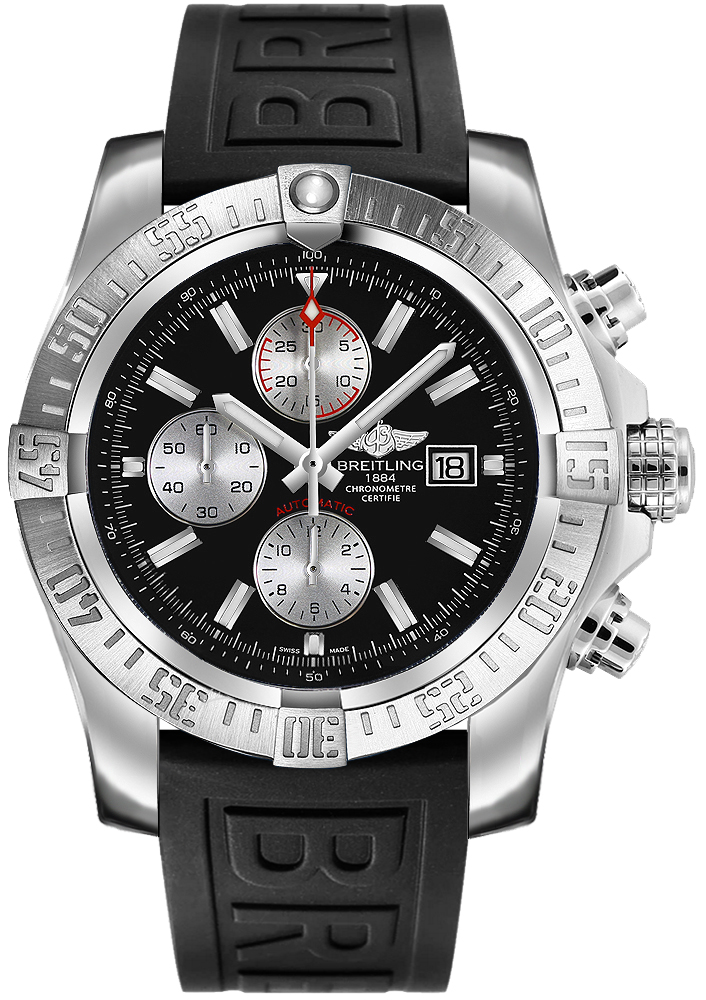 Breitling Super Avenger II A1337111/BC29-154S men's watch. Features a polished stainless steel case and black Breitling Diver Pro III rubber strap. Brushed stainless steel unidirectional rotating bezel engraved with Arabic numerals and indexes. Minute markers and 1/100th of a second scale around the outer rim. Volcano black dial with silver sub-dials. Luminescent hands and index hour markers. Date window displayed at 3 o'clock. Chronograph with large red-tipped central chronograph seconds hand, 30 minute counter sub-dial at 12 o'clock and 12 hour counter sub-dial at 6 o'clock. Small seconds sub-dial at 9 o'clock. Powered by the Breitling Caliber 13 self-winding automatic COSC Chronometer certified movement which boasts a 42 hour power reserve, beats at 28,800 vph and contains 25 jewels. A scratch resistant glareproof sapphire crystal protects the dial. The case is round, 48mm in diameter, weighs 150.10g and is 17.75mm thick. Inlet size: 24mm. Stainless steel solid screw down case back. Screwed-in pushpiece guards. Screw down crown with non-slip grip and two gaskets. Stainless steel tang buckle. Water resistant to 300 meters / 1000 feet. Functions: hours, minutes, small seconds, date, chronograph. Sport watch style. Swiss made.