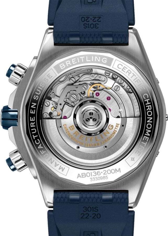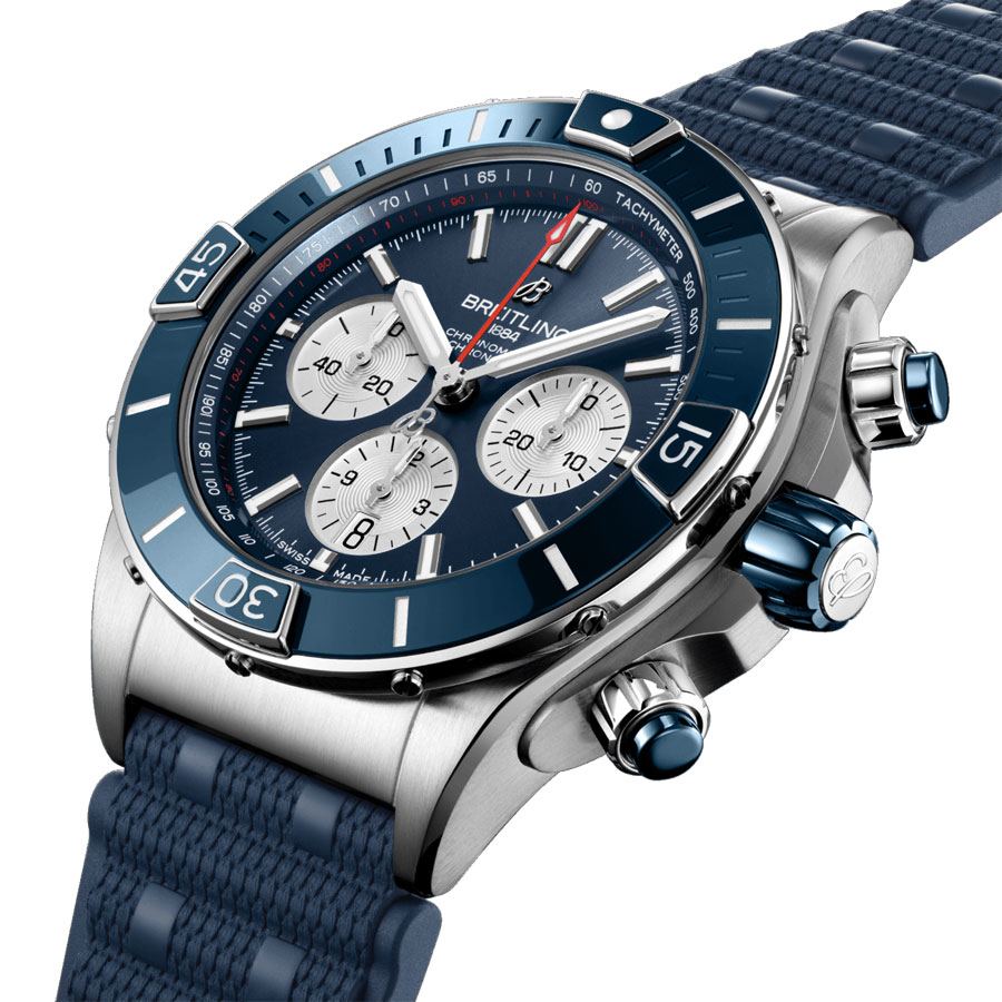 Breitling Super Chronomat B01 44 Men's Watch AB0136161C1S1. This 44mm watch features a stainless steel case with a blue ceramic bezel and a Rouleaux-inspired blue rubber strap. The blue dial has luminescent hands and index hour markers, a date window, a chronograph, and a tachymeter scale. It is powered by the Breitling Caliber 01 self-winding automatic COSC Chronometer certified movement with a 70-hour power reserve.