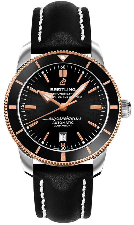 Breitling Superocean Heritage B20 Automatic 42 Men's Watch UB201012/BG53-435X. This 42mm watch features a polished stainless steel case and black leather strap. The black dial has luminescent hands and index hour markers, and a date window displayed at 6 o'clock. Is it powered by the Breitling Caliber B20 self-winding automatic COSC Chronometer certified movement with a 70 hour power reserve.