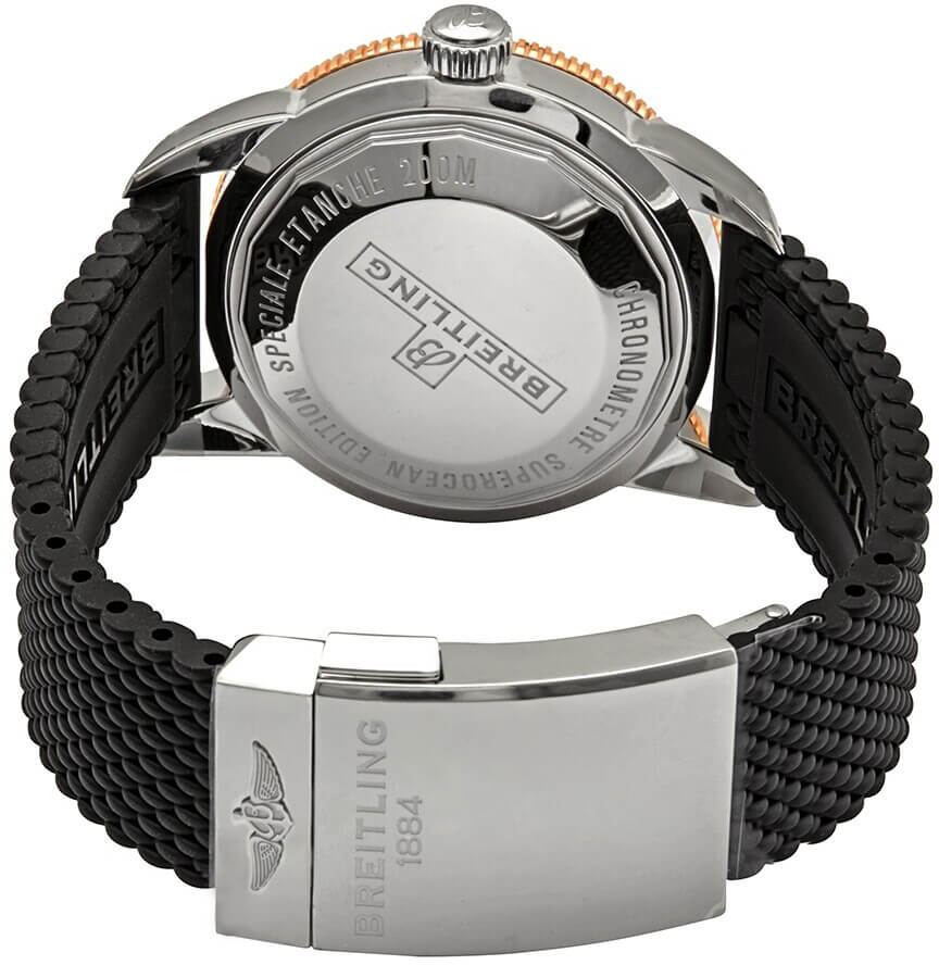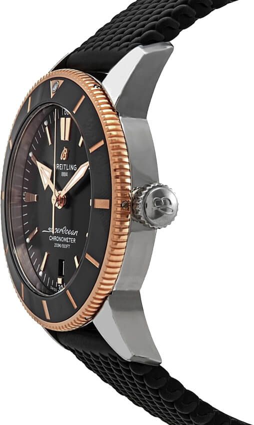 Breitling Superocean Heritage II B20 Automatic 44 UB2030121B1S1 men's watch. Features a polished stainless steel with solid 18k red gold case, with an ultra-hard, scratch resistant black high-tech unidirectional rotating ceramic bezel. Comes on a black Aero Classic rubber strap. The black dial has luminescent minute and hour hands, as well as luminescent dots at the ends of the index hour markers and a luminescent dot at the 12 o'clock position on the bezel. The date is displayed in a dial aperture at 6 o'clock. Powered by the Breitling Caliber B20 self-winding automatic chronometer certified movement which boasts a 70 hour power reserve, beats at 28,800 vph and contains 28 jewels. A cambered scratch resistant sapphire crystal glareproofed on both sides protects the dial. The case is round, 44mm in diameter and 14.55mm thick. The crown is screw-locked and has 2 gaskets. The case back is screwed in. Inlet width: 22 mm. 20mm stainless steel folding clasp with push-buttons. Water-Resistant to 200 meters / 660 feet. Functions: hours, minutes, seconds, date. Diving watch style. Swiss Made.