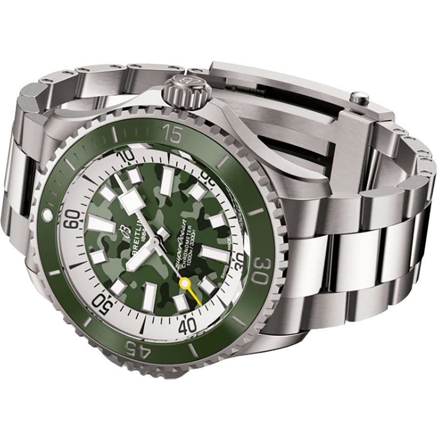 Experience the perfect blend of luxury and functionality with the Breitling Superocean Automatic 46 Super Diver timepiece. This watch features a striking green camouflage dial with index hour markers, all housed in a durable 46mm titanium case. The green ceramic bidirectional rotating bezel adds a touch of modern style, while the titanium bracelet ensures a comfortable fit on your wrist. Equipped with automatic movement and certified as a chronometer, this watch is a reliable companion for any adventure. Complete with a deployment buckle for added security, the Breitling Superocean Automatic 46 Super Diver is a must-have for watch enthusiasts and divers alike.