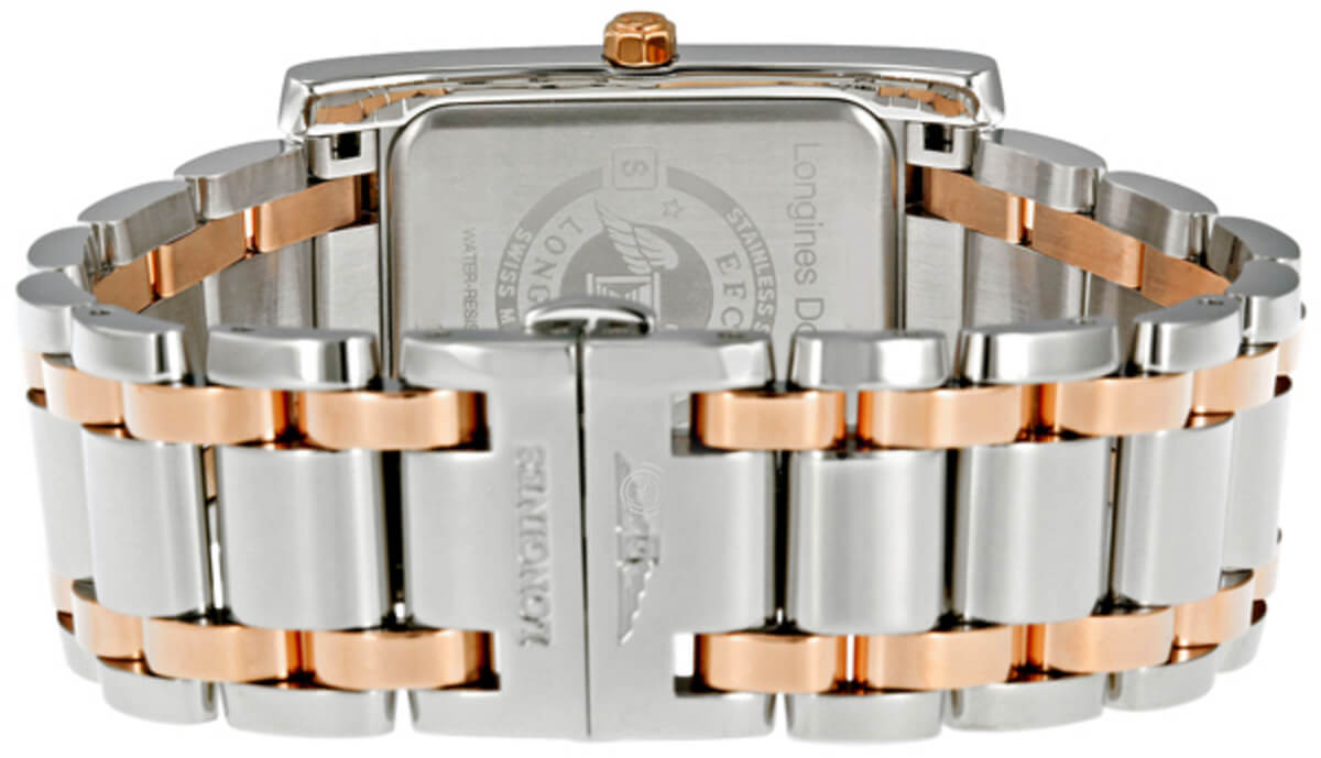 Longines DolceVita L5.655.5.88.7 men's watch. Features a polished stainless steel case and rose gold with stainless steel bracelet. Polished solid 18k rose gold fixed bezel. White Mother of Pearl dial with blue hands and 12 diamond hour markers. Small seconds sub-dial at 6 o'clock. Powered by the Longines caliber L176 battery operated quartz movement. The case is rectangular and 40mm x 27mm in diameter. Rose gold push and pull crown. Stainless steel deployment buckle. Water resistant to 30 meters / 100 feet. Functions: hours, minutes, small seconds. Fashion watch style. Swiss made.