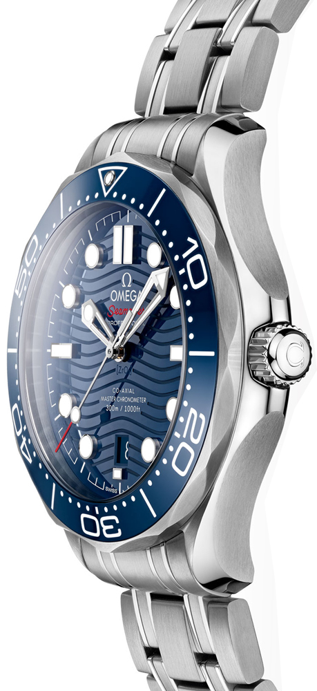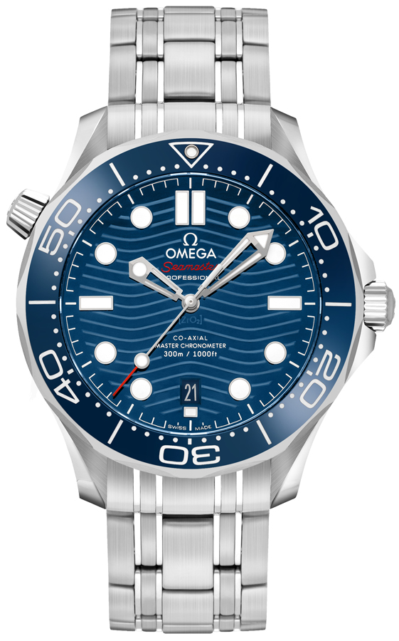 Omega Seamaster self-winding automatic master chronometer diver 210.30.42.20.03.001 men's watch. Round brushed with polished stainless steel case and bracelet. Blue ceramic dial with a laser-engraved wave pattern. White Super-LumiNova filed luminescent index and dot hour markers and skeleton hands. Unidirectional rotating blue ceramic bezel with a white enamel diving scale. Date feature located at 6 o'clock. Powered by the Omega caliber 8800 self-winding automatic master chronometer movement with an anti-magnetic feature and co-axial escapement which boasts a 55-hour power reserve. Total vibrations per hour: 25,200. Total jewels: 35. Helium escape valve located on the outer edge of the case at 10 o'clock. Domed scratch resistant sapphire crystal with anti-reflective treatment on both sides. Sapphire crystal exhibition case back. Screw down crown. Stainless steel deployment buckle. Water-resistant to 300 meters / 1000 feet. Functions: hours, minutes, seconds, date. Diving watch style. Swiss made.