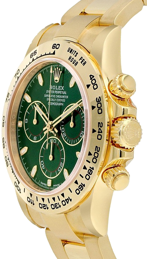 Rolex Cosmograph Daytona Men's Watch M116508-0013. This 40mm 18k yellow gold watch features an solid 18k yellow gold case with a solid 18k yellow gold bezel set with a tachymeter. It is fitted with a brushed with polished yellow gold Oyster bracelet. The striking green dial has luminescent hands and index hour markers, red accents and a chronograph feature. The watch is powered by the Rolex Caliber 4130 self-winding automatic COSC Superlative Chronometer certified movement with a 72 hour power reserve.