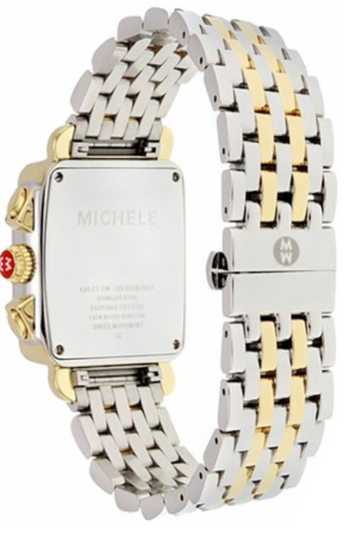 Michele Deco Two-Tone 18K Gold Diamond Women's Watch MWW06A000776. This 33mm x 35mm watch features a two-tone 18k yellow gold and stainless steel case and bracelet with a diamond-set bezel. The dial is white Mother of Pearl with diamond hour markers, a date window and small seconds sub-dial located at 6 o'clock, and a chronograph feature. It is powered by a battery-operated quartz movement.