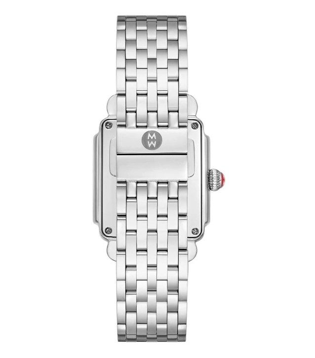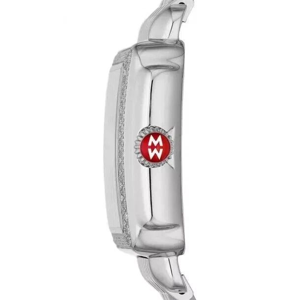 Michele Deco Madison MWW06T000163 women's watch. Features a polished stainless steel case and bracelet. 108 hand-set diamonds on the bezel and 47 atop the silver and white sunray dial. The total diamond count is 155 and weight is 0.71ct. Roman numeral hour markers. Luminescent minute and hour hands. The date is displayed in a window at 6 o'clock. Powered by a battery operated quartz movement. A scratch resistant sapphire crystal protects the dial. The case is rectangular and 33 mm x 35 mm in diameter. Inlet size: 18 mm. Push and pull crown. Stainless steel deployment buckle. The stainless steel bracelet is interchangeable with any 18 mm Michele strap. Water resistant to 50 meters / 165 feet. Functions: hours, minutes, seconds, date. Fashion watch style. Swiss Made.