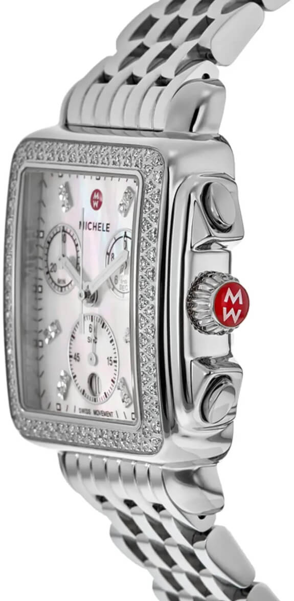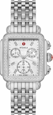 Michele Deco Stainless Diamond Women's Watch MWW06A000775. This 33mm x 35mm watch features a stainless steel case and bracelet with a diamond-set bezel. The white Mother of Pearl dial has diamond hour markers with a date window, a chronograph, and a small seconds sub-dial at 6 o'clock. It is powered by a battery-operated quartz movement.