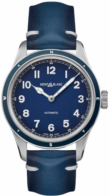 This timepiece showcases a brushed stainless steel case paired with a blue leather strap. The blue dial features luminescent hands and Arabic numeral hour markers for enhanced readability. It runs on the MontBlanc Caliber MB 24.15 automatic movement, offering a 38-hour power reserve and incorporating 26 jewels. The dial is protected by a scratch-resistant sapphire crystal. The round case measures 40mm in diameter with a 20mm lug width. Additional features include a solid case back, screw-down crown, and a stainless steel tang buckle. Water-resistant up to 100 meters (330 feet), this Swiss-made watch combines everyday wearability with classic style.