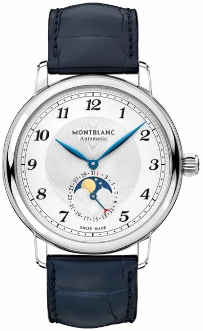 The MontBlanc Star Legacy Moonphase 117578 is a refined timepiece with a classic and timeless appeal. It showcases a 42mm stainless steel case, a fixed steel bezel, and a blue leather strap secured with a deployment buckle. The silvery-white dial features Arabic numeral hour markers and a date-by-hand display. Powered by an automatic movement, this watch makes a sophisticated statement. Combining style, quality, and MontBlanc’s signature design, the Star Legacy Moonphase 117578 is a standout addition to any everyday wardrobe.