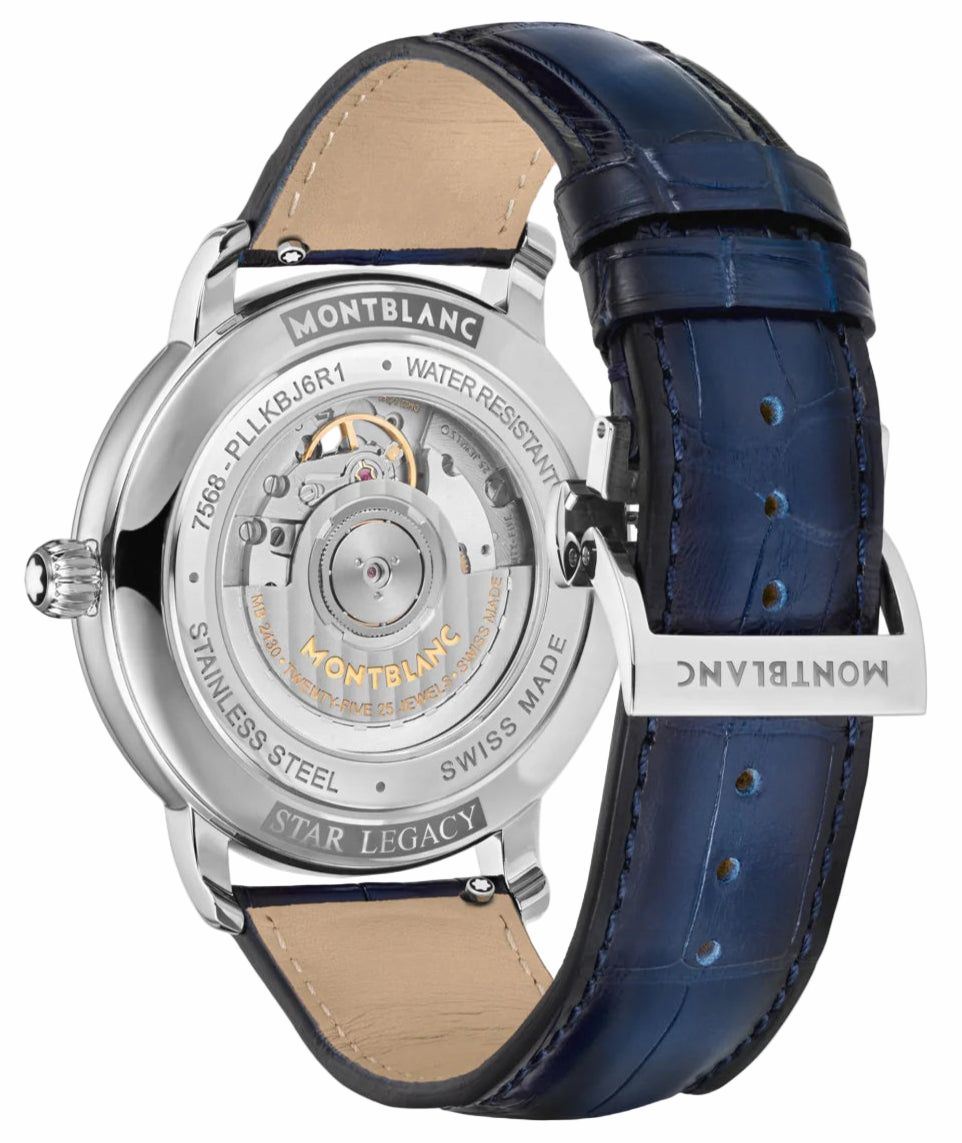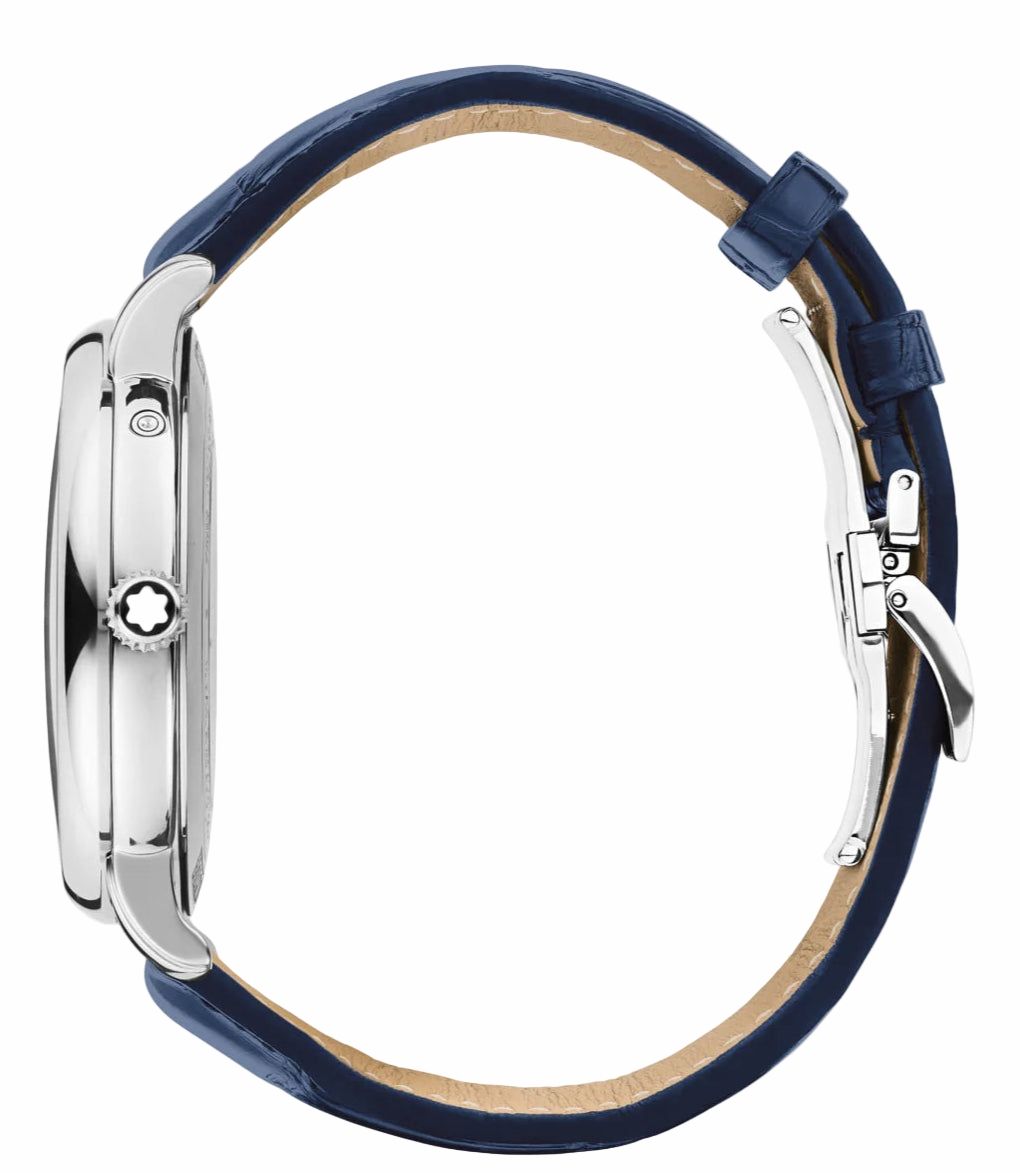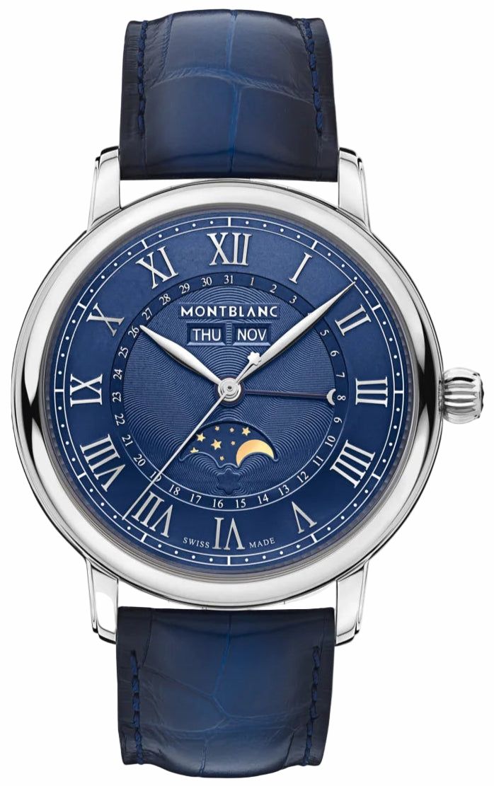 The MontBlanc Star Legacy 130967 is a sophisticated timepiece that blends timeless design with refined craftsmanship. It features a 42mm stainless steel case, a fixed bezel, and a rich blue leather strap secured with a deployment clasp. The blue dial is adorned with elegant Roman numeral hour markers, offering a classic aesthetic. Powered by an automatic movement, this full calendar watch delivers both style and functionality. Whether worn for business or casual occasions, this Swiss-made watch brings a touch of elegance to your everyday look — a true staple for the modern gentleman.