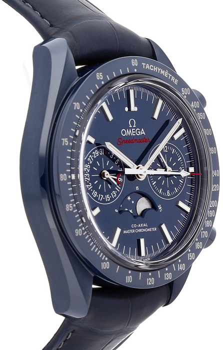 You’ll be blue if you miss this low price. The New 44MM Omega Speedmaster Moonwatch Co-Axial Moonphase Blue side of the Moon Pitch Black Edition Men’s watch model 304.93.44.52.03.001 features a blue ceramic case with a push & pull crown and a patterned blue leather strap. The ceramic blue dial is accentuated with luminescent hands & index hour markers, a date feature, and a chronograph feature beneath a scratch-resistant sapphire crystal with anti-reflective treatment. A fixed blue ceramic bezel has a tachymeter scale feature. This captivating watch is driven by COSC Certified Self-winding automatic movement with a 60-hour power reserve.