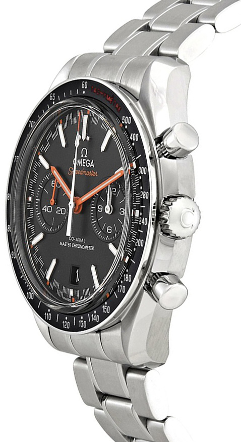 Omega Speedmaster Racing Men's Luxury Watch 329.30.44.51.01.002. This 44.25mm watch features a stainless steel case and bracelet with a black ceramic bezel engraved with a tachymeter scale. The black dial has orange hour and minute hands with a chronograph feature, a date window, and a small seconds sub-dial at 9 o'clock. It is powered by the Omega Caliber 9900 self-winding automatic Co-Axial COSC Chronometer certified movement with a 60 hour power reserve.