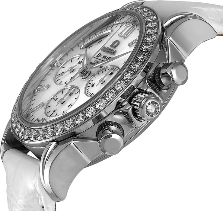 Amazing style for a new low sale price is now available with the Swiss-made Omega De Ville Chronograph Women’s 35mm luxury watch model 4679.75.36. Featuring a solid 18K white gold case with a sapphire crystal exhibition case and a patterned white leather strap with a push-button folding clasp deployment buckle. A Mother of Pearl white dial is accentuated with luminescent hands & index hour markers, a date feature, a column wheel chronograph feature, a 30-minute counter sub-dial, a 12-hour counter sub-dial, and a small seconds sub-dial, all encompassed in a solid 18K white gold bezel set with 42 diamonds. A COSC Certified self-winding automatic movement and a 52-hour power reserve drive this breath-taking watch.