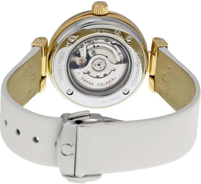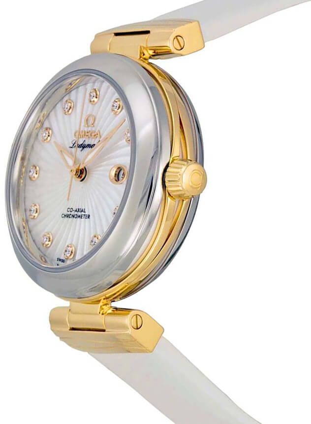 A new low price for luxury style is now available with the Swiss-made Omega De Ville Ladymatic 34mm Women’s watch model 425.22.34.20.55.002. Featuring a polished stainless steel with solid 18K yellow gold case, a sapphire crystal exhibition case back, an 18K yellow gold screw-down crown, and a white leather strap with stainless steel deployment buckle. A supernova patterned Mother of Pearl white dial is accentuated with 11 diamond hour markers, luminescent hands, and a date feature all encompassed by a polished stainless steel bezel. This stunning watch is driven by COSC Certified self-winding automatic movement with a 50-hour power reserve.