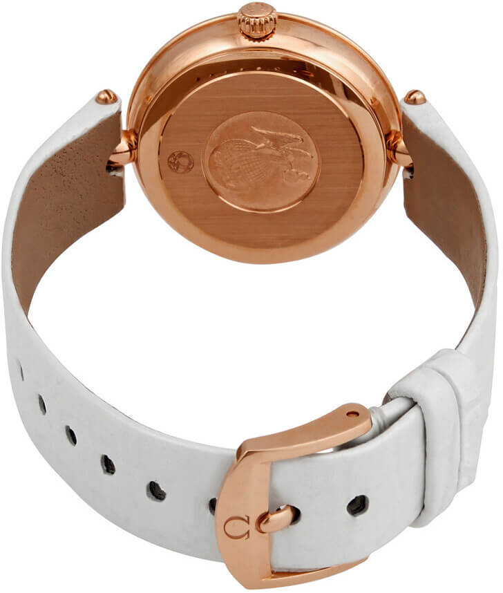 The Omega De Ville Prestige 424.53.27.60.55.002 is a stunning timepiece with a classic and luxurious look. The white mother of pearl dial features diamond and roman numeral hour markers, giving it a timeless appeal that will never go out of style. The solid 18k rose gold case measures 27.4mm and is paired with a white leather strap and rose gold tang buckle to complete the design. Powered by quartz movement, this watch delivers reliability with uncompromised precision for accurate timekeeping day in and day out.