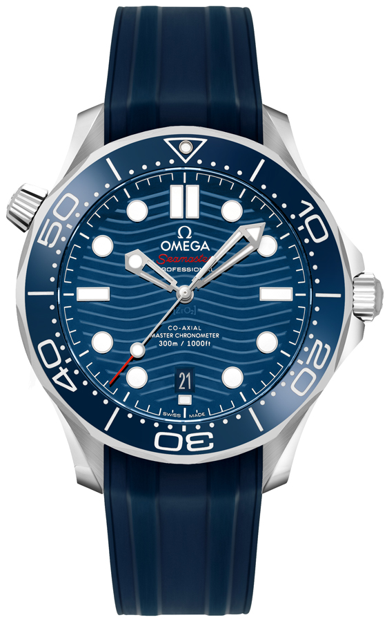 Omega Seamaster self-winding automatic co-axial 210.32.42.20.03.001 men's watch. Round brushed with polished stainless steel case on a blue rubber strap. Blue ceramic dial with laser-engraved waves. White Superluminova filled luminescent index and dot hour markers. White Superluminova filled luminescent skeleton hands. Unidirectional rotating blue ceramic bezel. Date feature located at 6 o'clock. Helium escape valve located at the 10 o'clock position. Anti-magnetic feature. Powered by the Omega caliber 8800 self-winding automatic master chronometer movement which boasts a 55 hour power reserve. Total vibrations per hour: 25,200. Total jewels: 35. Domed scratch resistant sapphire crystal with anti-reflective treatment on both sides. Sapphire crystal exhibition case back. Screw down crown. Stainless steel tang buckle. Water-resistant to 300 meters / 1000 feet. Functions: hours, minutes, seconds, date, anti-magnetic movement, helium escape valve. Diving watch style. Swiss made.