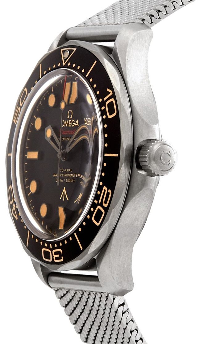 The new 42mm Omega Seamaster Diver 007 James Bond No Time to Die Edition Men’s M21090422001001 is a Swiss-made Men’s watch featuring a brushed titanium case and polished titanium mesh bracelet with titanium deployment buckle. The deep brown dial is adorned with luminescent dot & index hour markers and encompassed by a brown tropical aluminum bezel with beige diving scale. This daring watch is driven by Omega Caliber 8806 with self-winding automatic Master Chronometer movement and features a 55 hour power reserve.