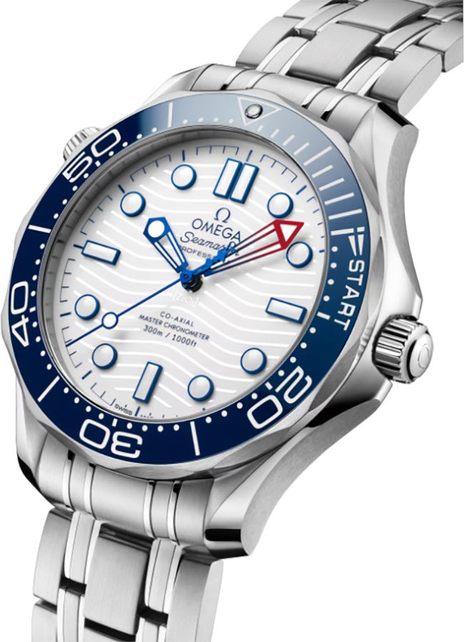 Experience the perfect blend of luxury and quality with the Omega Seamaster Diver America's Cup 210.30.42.20.04.002. This timepiece features a striking white dial adorned with a unique wave pattern, complemented by dot and index hour markers for easy readability. The 42mm stainless steel case is both durable and stylish, while the blue ceramic bezel with regatta scale adds a pop of color. Equipped with a helium escape valve and a foldover clasp with diver extension, this automatic chronometer is as functional as it is stylish. Plus, its anti-magnetic properties ensure precision timekeeping. Elevate your watch collection with the Omega Seamaster Diver America's Cup.