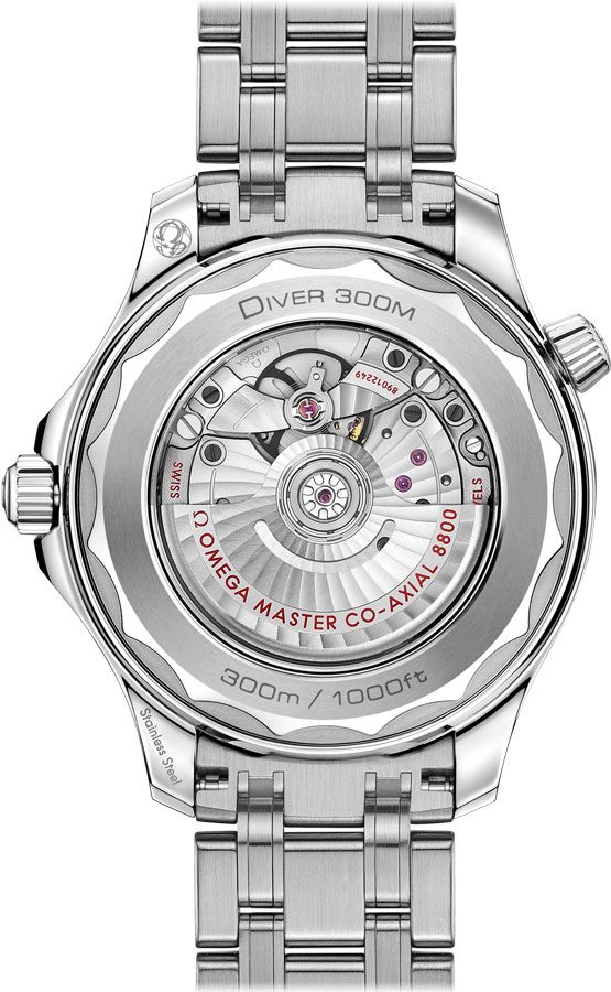 Omega Seamaster Diver 300M Co-Axial Master Chronometer 42mm Men's Watch 210.30.42.20.10.001. This watch features a stainless steel case and bracelet. The green ceramic bezel has a white enamel diving scale. A helium escape valve is located on the side of the case at 10 o'clock. The green dial has a wave pattern, dot and index hour markers, and a date window displayed at 6 o'clock. It is powered by the Omega Caliber 8800 self-winding automatic Co-Axial Master Chronometer movement with an anti-magnetic feature and a 55 hour power reserve.