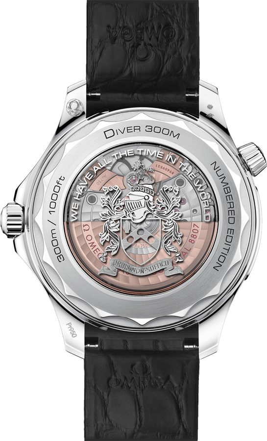The Omega Seamaster Diver 300M James Bond 210.93.42.20.01.001 is a limited edition timepiece, limited to 50 pieces and inspired by the iconic 007 himself. This stunning watch features a black dial with luminous hour markers and a ceramic unidirectional rotating bezel with a platinum diving scale. The case is crafted from polished and brushed platinum and is presented on a black leather strap with a folding clasp. Powered by the Omega Co-Axial calibre 8807 movement, this watch is also COSC chronometer certified and METAS master chronometer certified, meaning it has been tested to meet high precision standards.