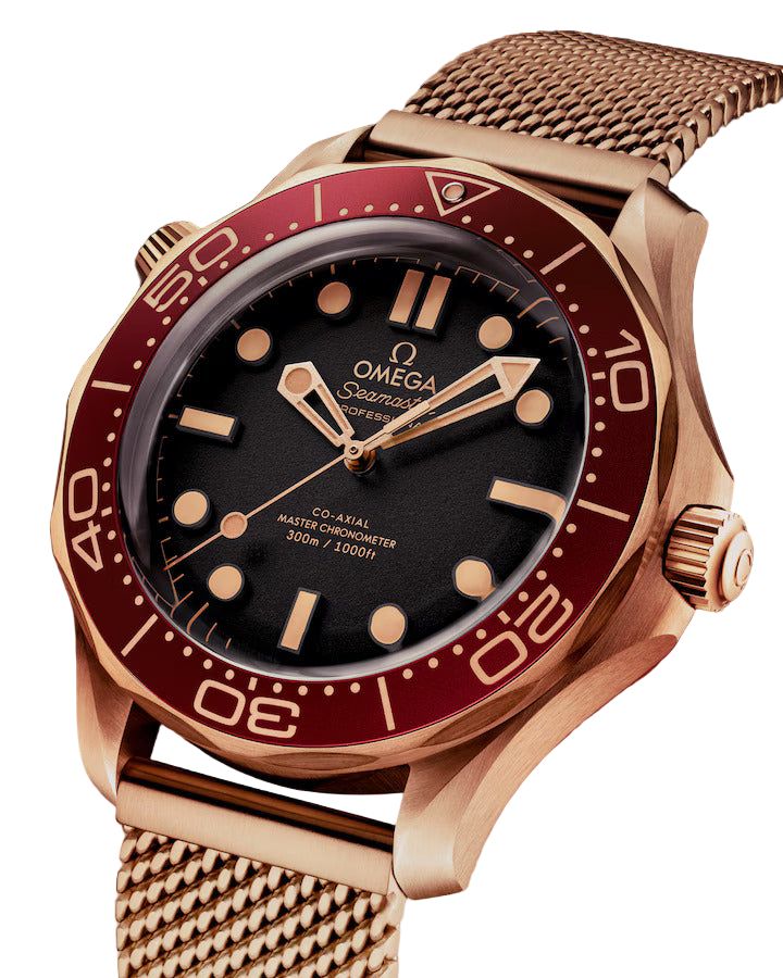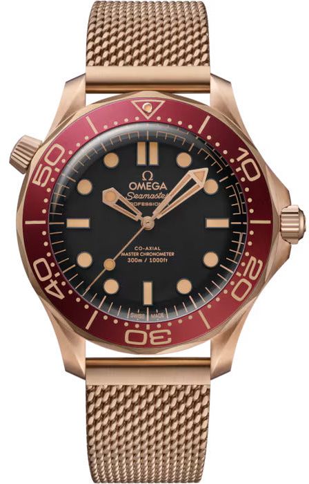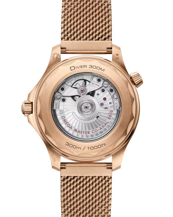 The Omega Seamaster Diver 300M, reference 210.90.42.20.01.003, is an elegant yet robust diver's watch crafted from Omega's exclusive Bronze Gold alloy. It features a 42mm case and a black dial complemented by a striking burgundy aluminum bezel. The Bronze Gold mesh bracelet fastens with a secure deployment buckle. Designed for high performance, this timepiece is water-resistant to 300m and equipped with a helium escape valve. Its anti-magnetic Co-Axial Master Chronometer Calibre 8806 automatic movement is visible through a transparent caseback, offering both style and precision.
