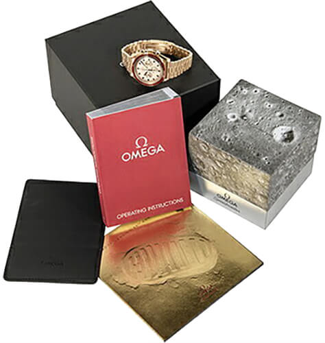 Omega Speedmaster Apollo 11 Limited Men's Watch 310.60.42.50.99.001. This 42mm luxury watch features a solid 18k moonshine gold case and bracelet with a burgundy ceramic bezel. The 18k moonshine gold dial has index hour markers, chronograph, small seconds, and an anti-magnetic feature. It is powered by the Omega Caliber 3861 COSC Master Chronometer certified manual winding movement with a 50-hour power reserve.
