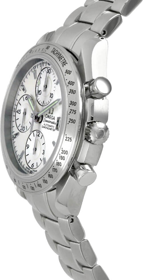 Omega Speedmaster Date Chronograph 40mm men's watch 3211.30.00. This timepiece features a stainless steel case paired with a stainless steel bracelet. The stainless steel fixed bezel is engraved with a tachymeter scale. Silver dial with indexes and hour-minute hands that are coated in Super-LumiNova. Powered by the Omega calibre 1164 self-winding chronograph movement. Functions: hours, minutes, small seconds, chronograph, tachymeter. Sport watch style. Swiss made.