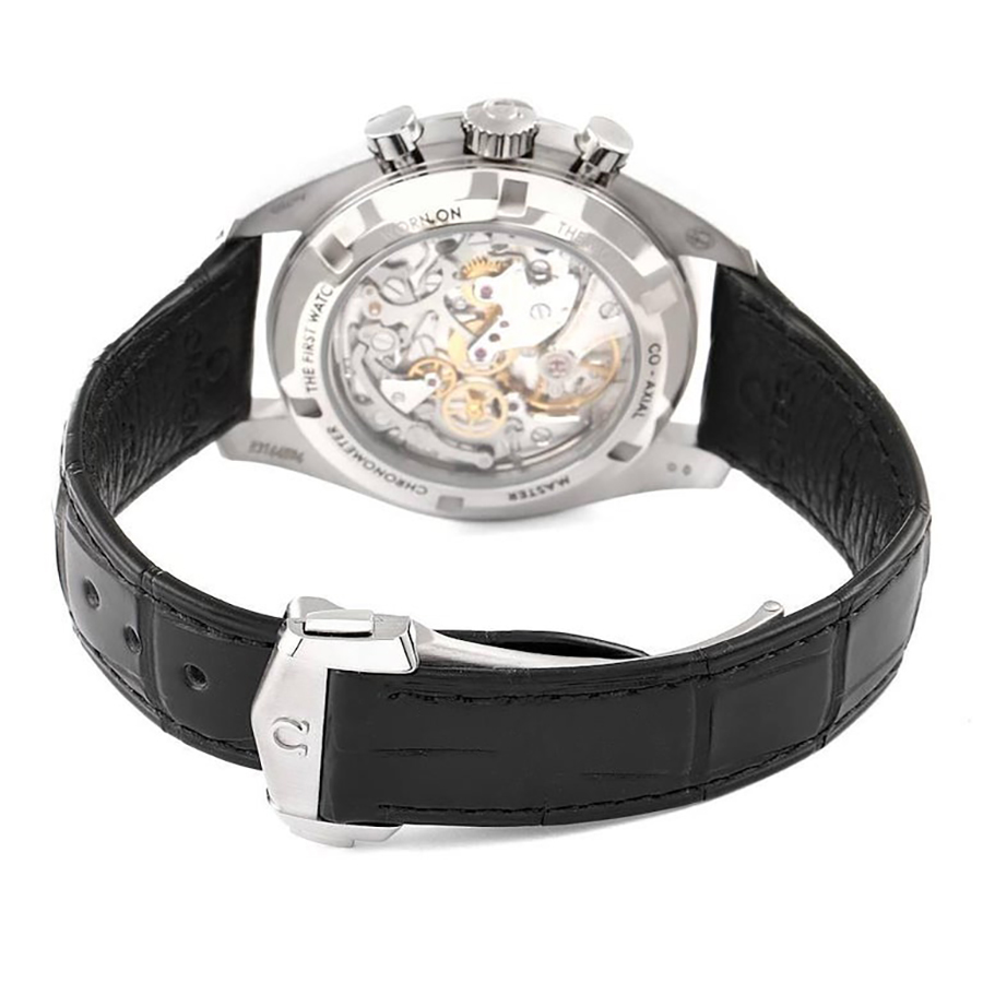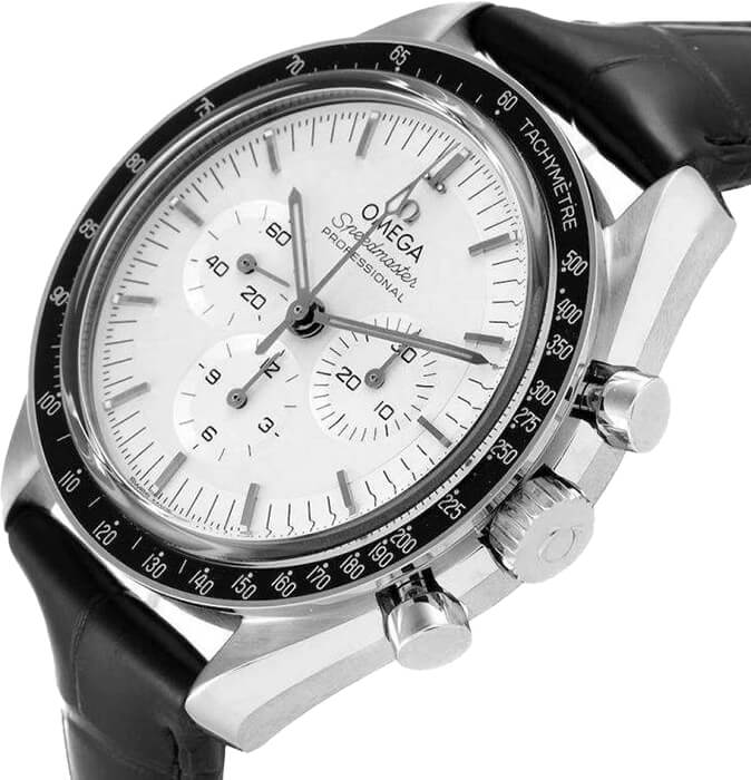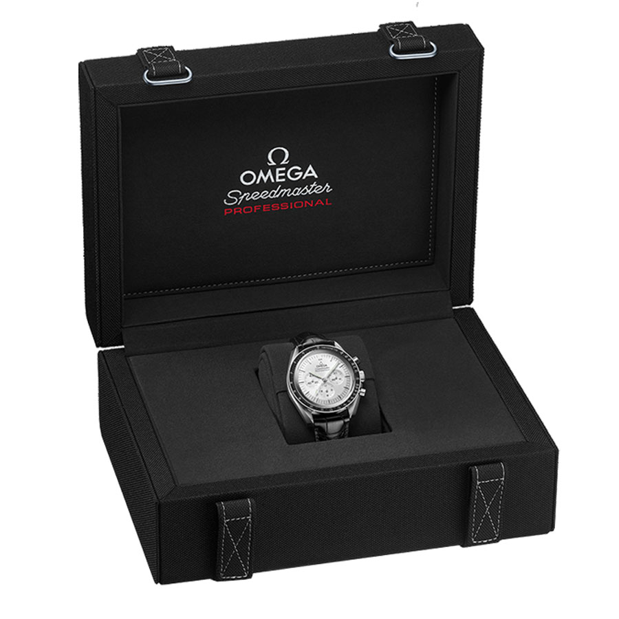 Omega Speedmaster Moonwatch Professional Men's Watch 310.63.42.50.02.001. This new luxury Speedmaster model from Omega features a solid 18k white 'Canopus' gold case and is fitted with a black leather strap with a pattern. A tachymeter scale is engraved on the black anodized aluminum bezel ring. The silver dial has index hour markers and a chronograph feature that includes a small seconds sub-dial at 9 o'clock. This watch is powered by the Omega Caliber 3861 Co-axial Master Chronometer manual winding COSC certified movement with a 50-hour power reserve.